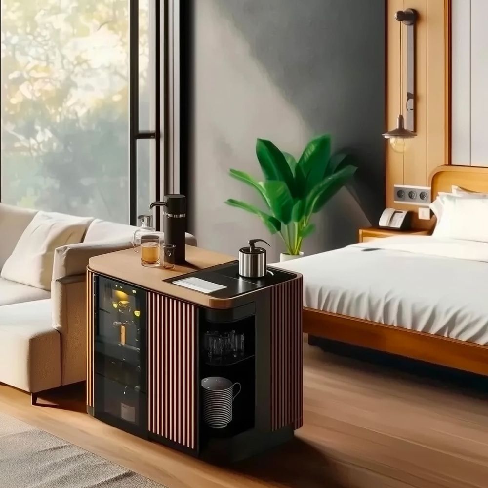 Avec à sa tablette en verre, elle peut aussi faire office de tablette en bout de canapé, pour créer un espace dédié à la convivialité.